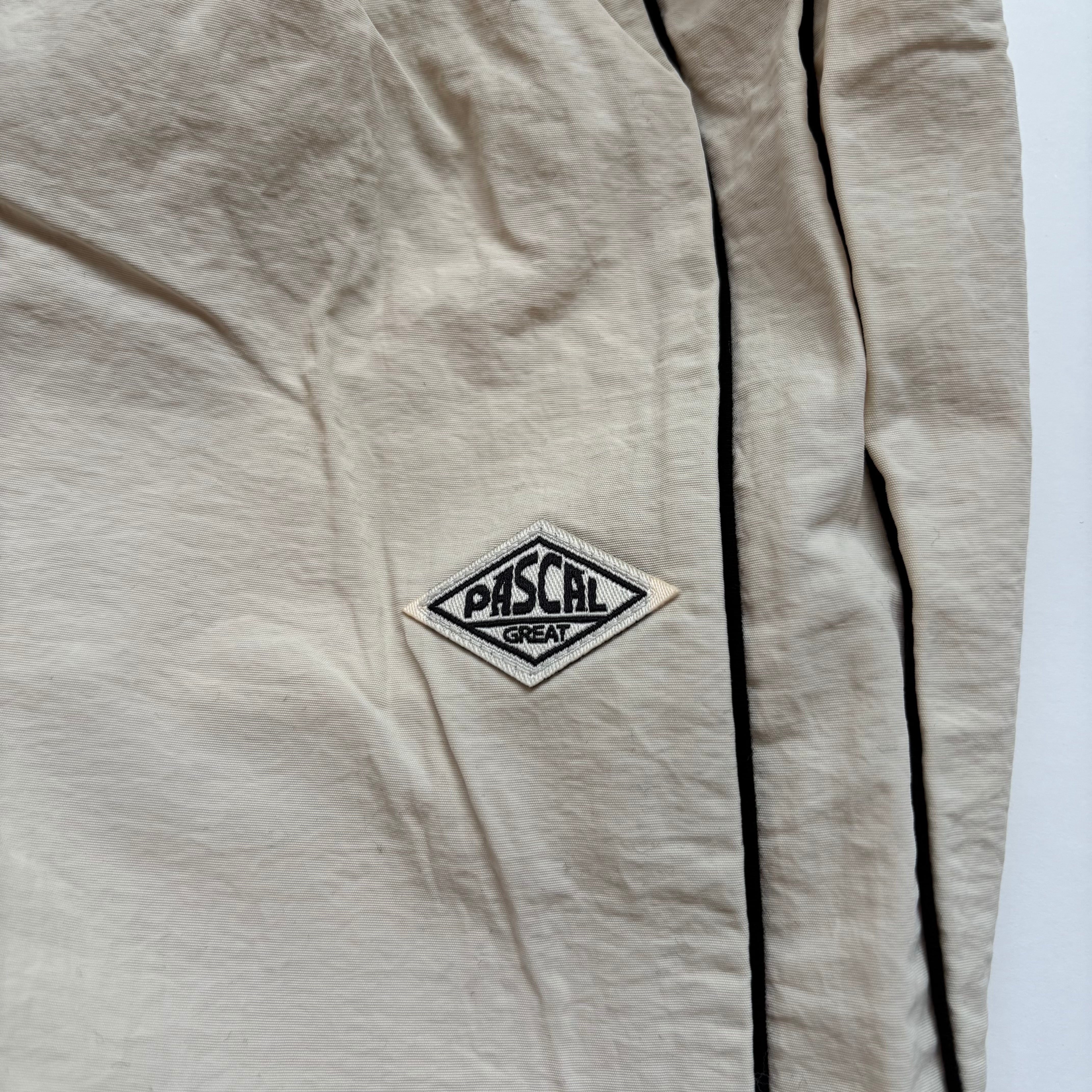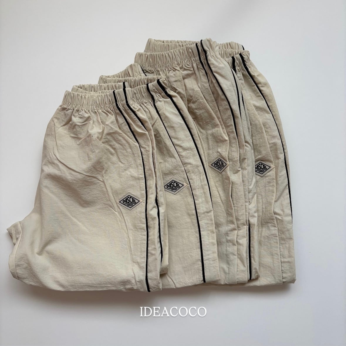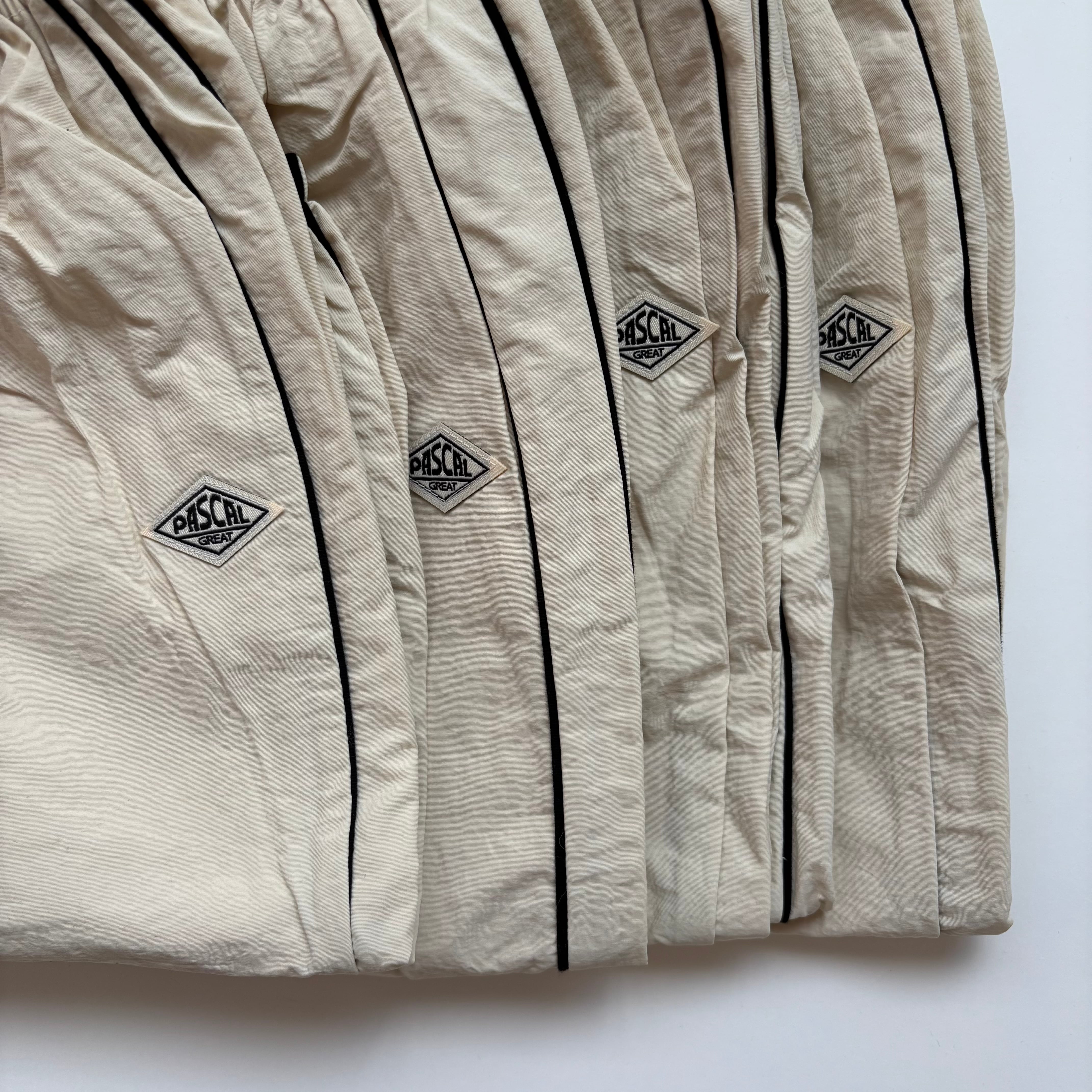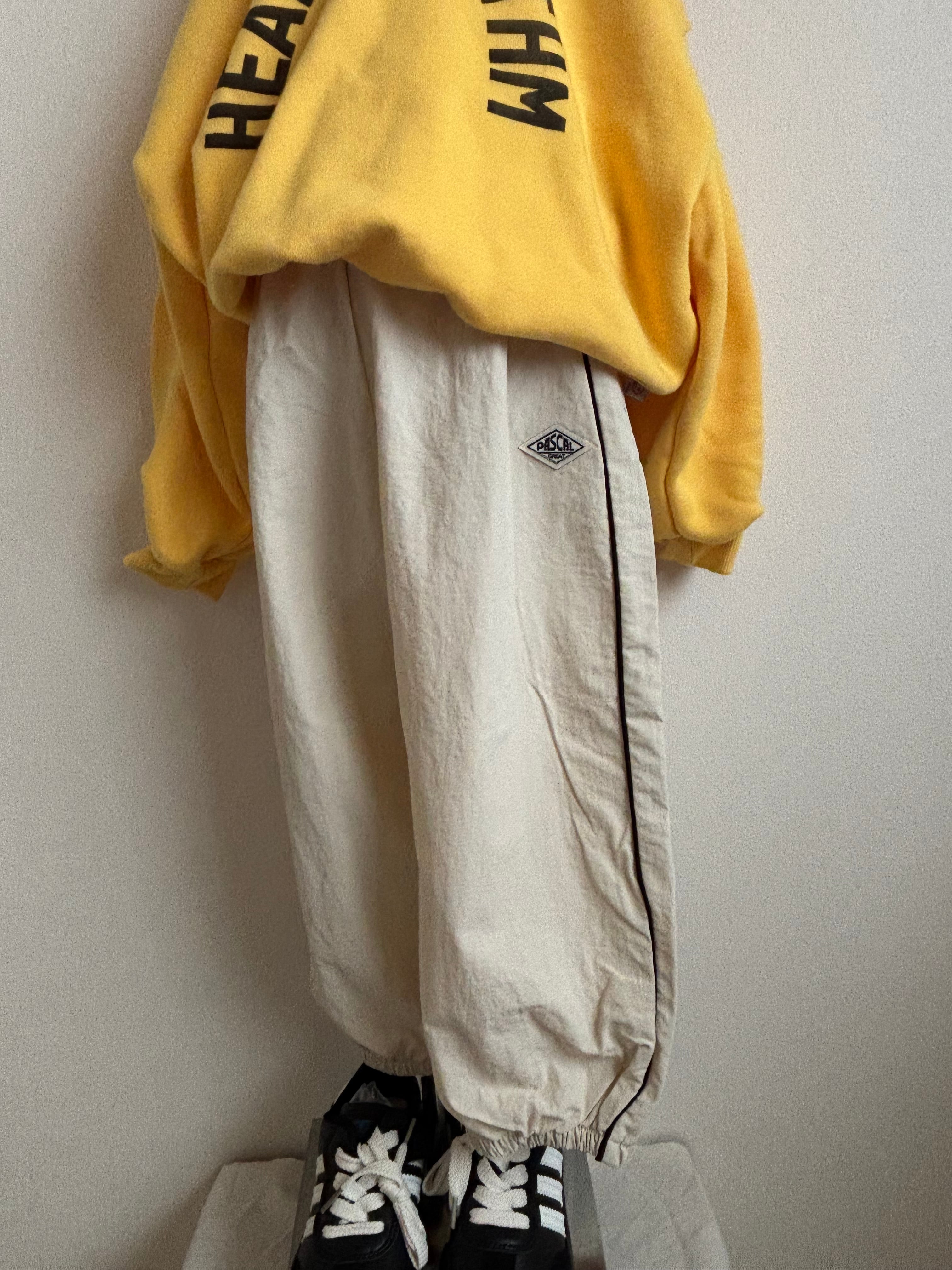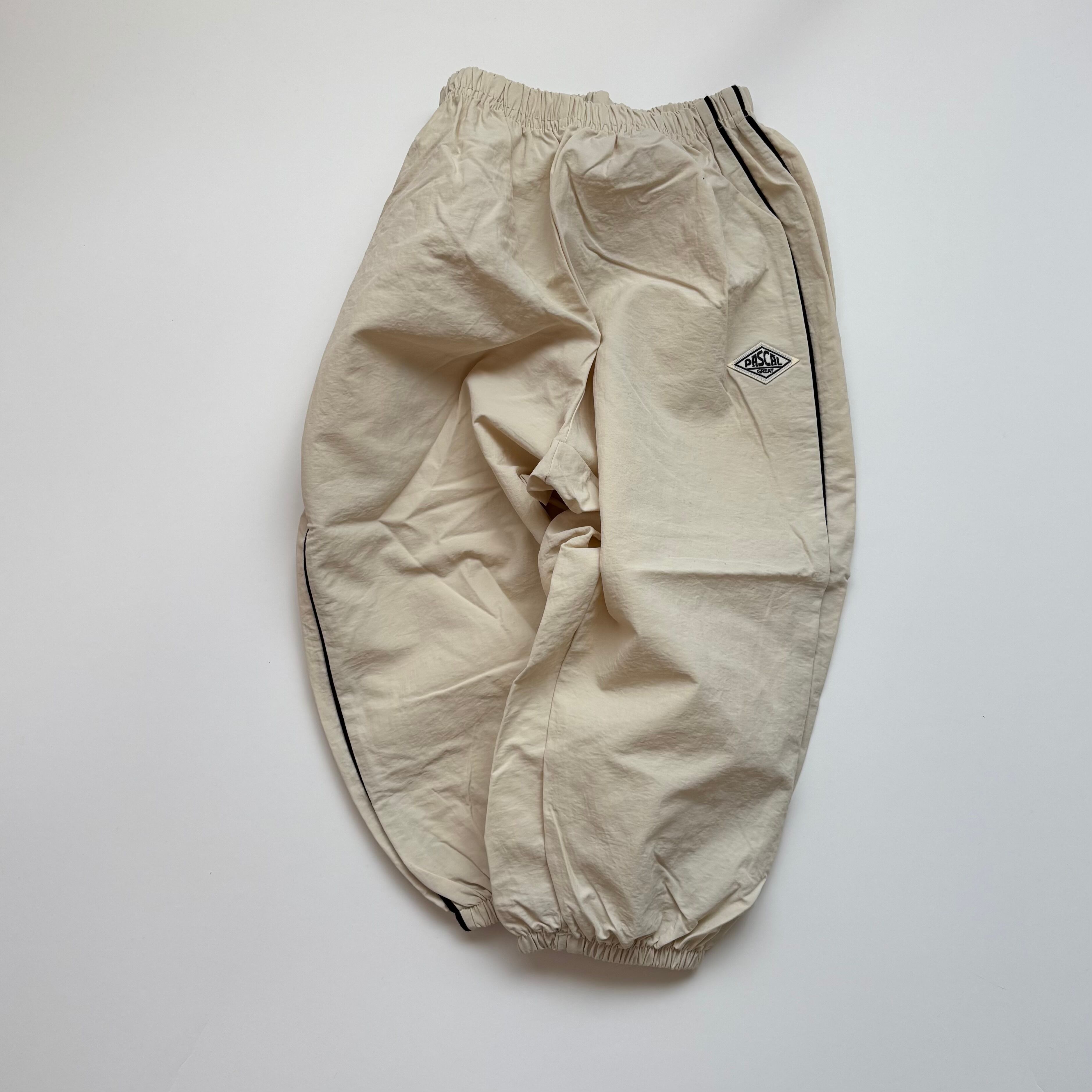 春先にぴったりの、軽くて動きやすいナイロン素材のラインパンツ。